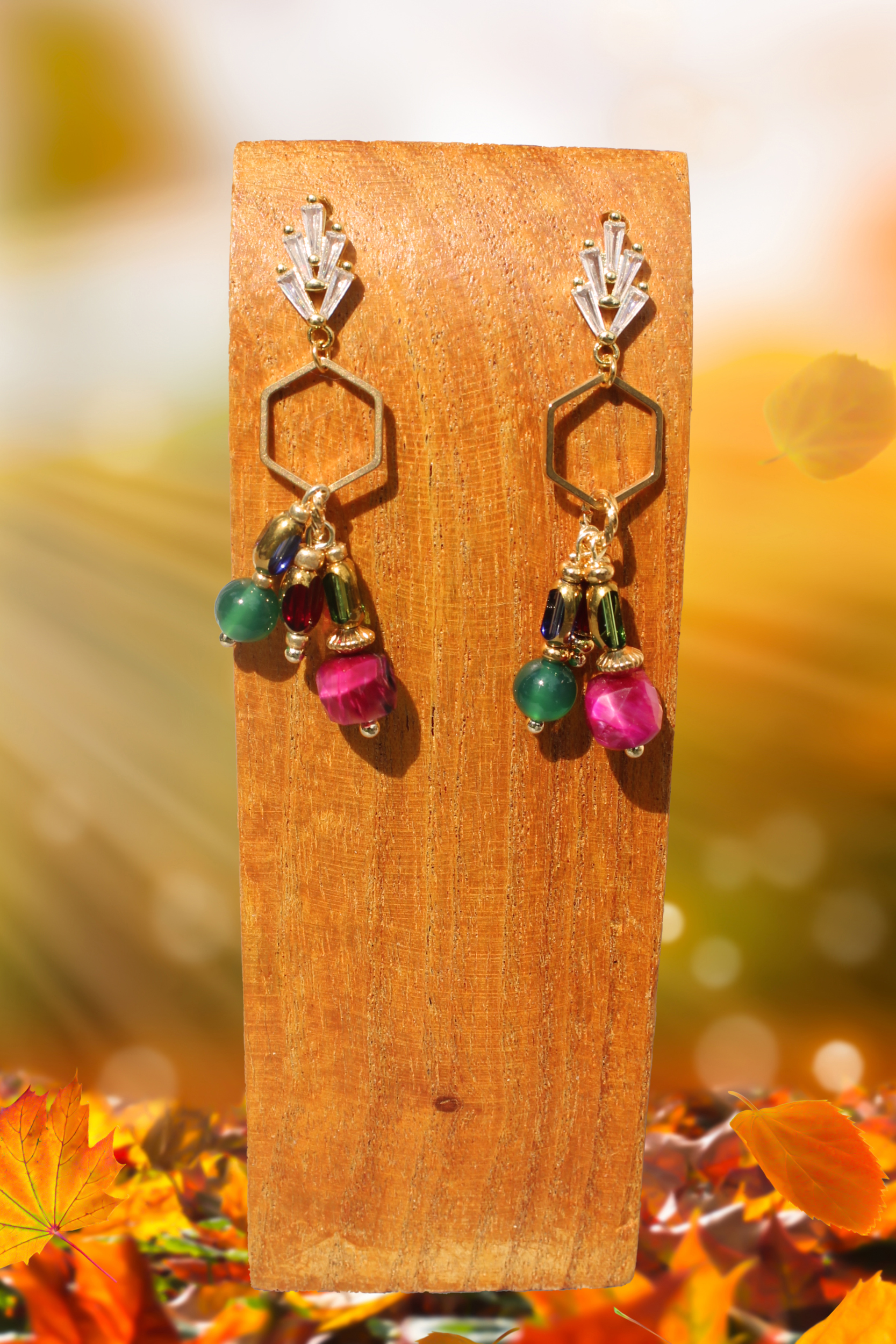 Add a pop of natural color to your look with this elegant handmade drop earring. Featuring a delicate vertical arrangement of four faceted gemstones in rich golden yellow, olive green, deep raspberry, and teal blue tones, each stone is beautifully wire-wrapped with silver findings for a clean, polished finish. Lightweight and versatile, this earring offers a subtle yet sophisticated touch — perfect for both casual and dressy occasions.