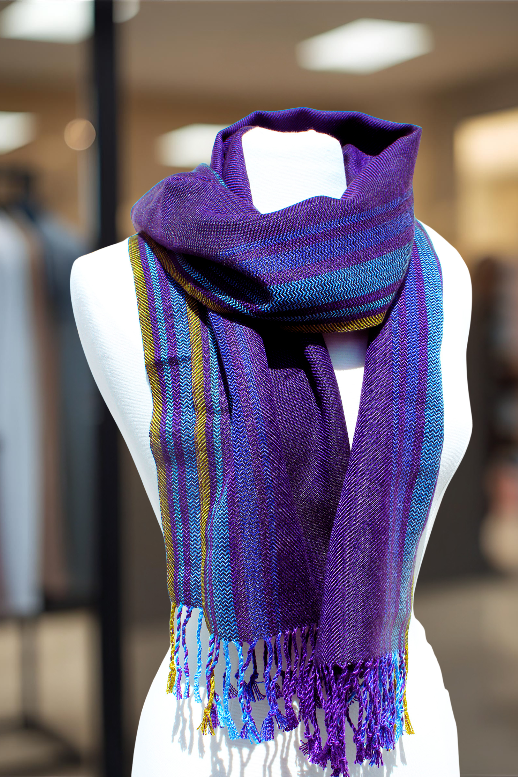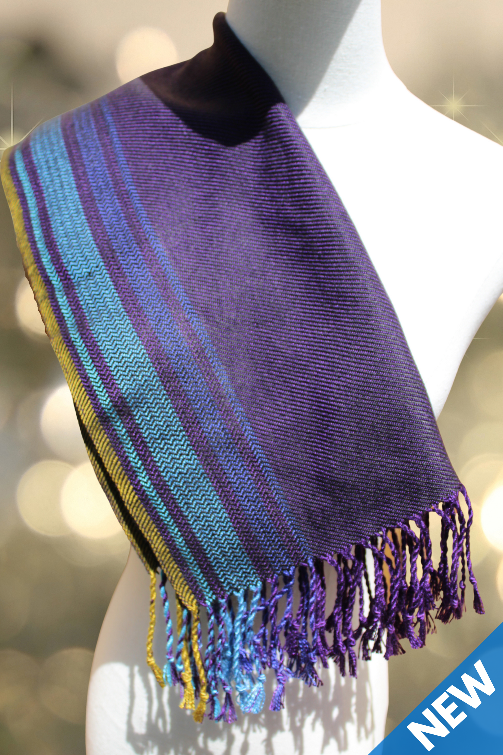 This elegant handwoven scarf blends deep violet with vibrant accents of teal, olive, and blue in a striking striped design. The intricate herringbone weave adds rich texture and dimension, while the playful twisted fringe provides a lively finishing touch. Both earthy and luminous, its tones make it a versatile accessory—equally perfect for layering on cool evenings or elevating your everyday style.