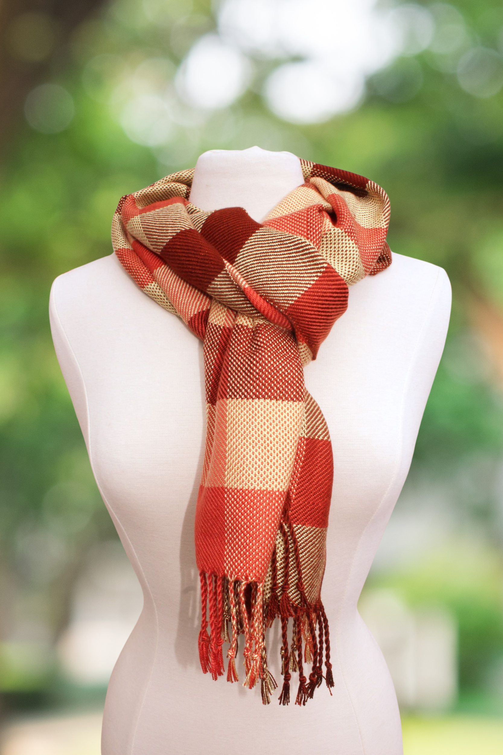 Wrap yourself in the warmth of autumn with this handwoven scarf, featuring a classic checkered plaid design in earthy rust, golden beige, and soft cream. The subtle variations in color and texture give it a rustic charm, while the soft drape and playful fringe make it as inviting to wear as it is beautiful to gift.